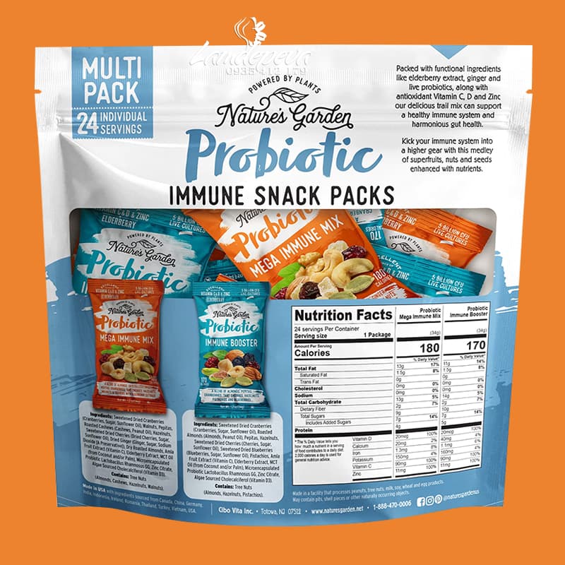 ➤ Hạt hỗn hợp Probiotic Immune Snack Packs là các loại hạt được chọn lọc, hương vị tươi ngon, không chứa gluten, không chất bảo quản, không thêm các chất phụ gia độc hại.