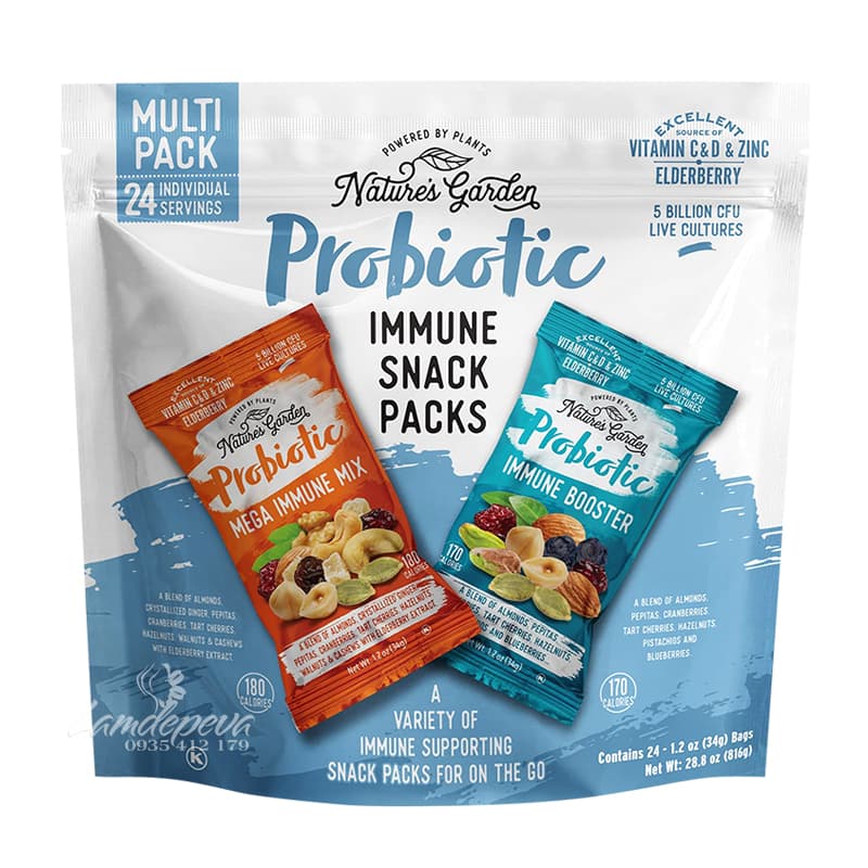 Hạt hỗn hợp Probiotic Immune Snack Packs là siêu phẩm được yêu thích tại Mỹ. Mỗi túi chứa 24 gói nhỏ vô cùng thuận tiện cho những chuyến đi. Hạt hỗn hợp được lựa chọn từ những nguyên liệu tươi ngon và giá trị dinh dưỡng cao.