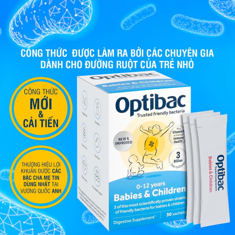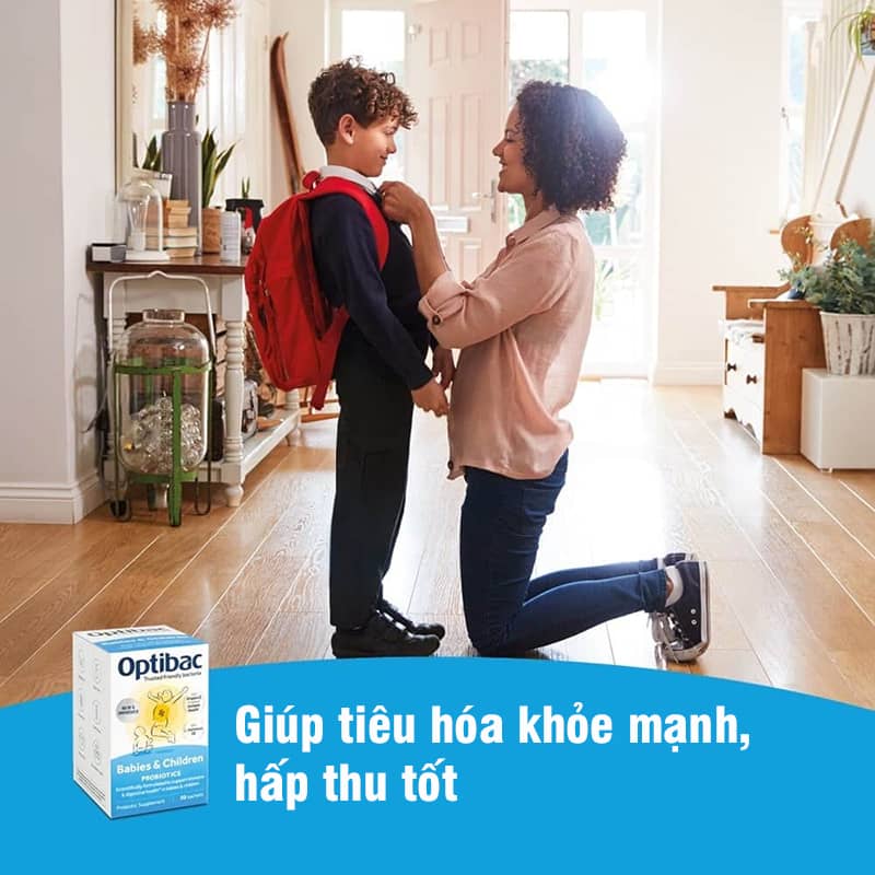 => Vậy thì, Men vi sinh Optibac Babies & Children chính là giải pháp bổ sung tuyệt vời cho con bạn. Men vi sinh Optibac xanh điều chế dành cho trẻ em từ 0 -12 tuổi, với công thức độc đáo kết hợp 3 chủng men chất lượng cao và đã được ưa chuộng trên khắp Thế giới, hứa hẹn mang lại hiệu quả nhanh chóng. Ngoài ra, với mỗi gói cung cấp đến 3 tỷ lợi khuẩn sống, thêm vitamin D3 và chất xơ, sản phẩm sẽ giúp tăng cường chức năng tiêu hóa, hấp thu dưỡng chất, củng cố hệ miễn dịch, phòng ngừa bệnh vặt, đồng thời cải thiện các chứng đau bụng, đầy hơi, khó tiêu, rối loạn tiêu hóa, táo bón, tiêu chảy,....