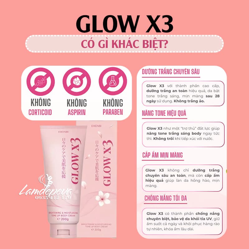Glow X3 là một sản phẩm dưỡng trắng da body được phát triển bởi thương hiệu Eikenbi. Với công thức độc đáo kết hợp Arbutin, Glutathione, vitamin C và Niacinamide, Glow X3 hứa hẹn bật tông da trắng mịn chỉ sau 28 ngày.