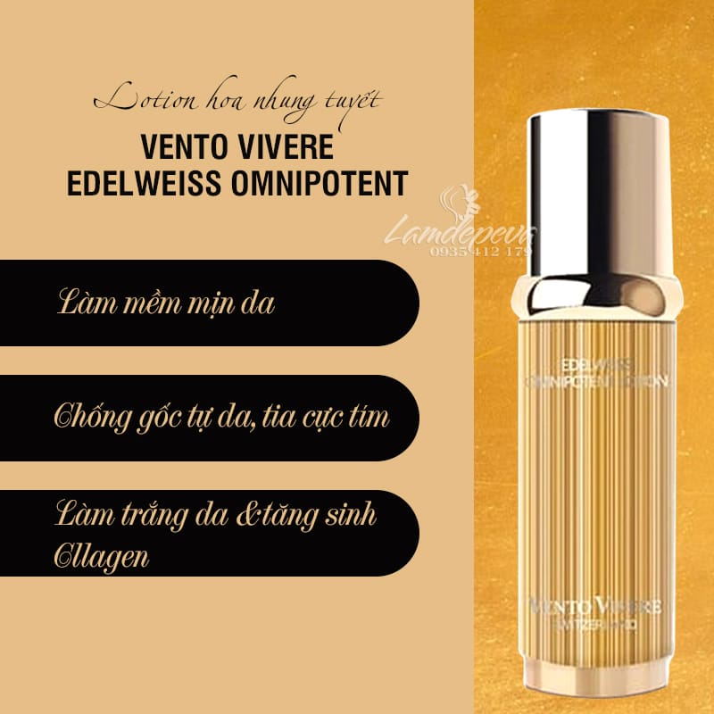 Lotion hoa nhung tuyết Vento Vivere Edelweiss là siêu phẩm hot đang được chị em phụ nữ săn đón. Lotion chiết xuất từ hoa nhung tuyết, rau má, quả bơ, và nước băng tan giúp da sáng khỏe, bảo vệ da trước tia cực tím, làm phân tán sắc tố da, nâng tông da rạng rỡ, đàn hồi.