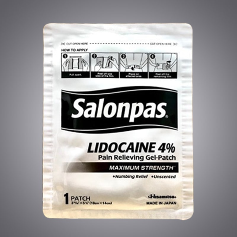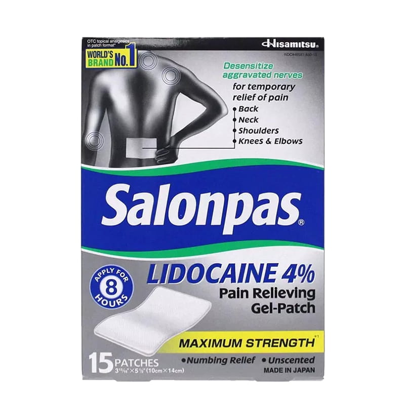 Miếng dán giảm đau Salonpas Lidocaine 4% được đánh giá 4.6 sao trên Amazon. Đây là loại miếng dán giảm đau tốt hàng đầu hiện nay, công thức mạnh mẽ, hiệu quả nhanh chóng và kéo dài đến 8 tiếng, đối với vùng khớp bị viêm, bong gân, bầm tím, nhức cơ xương,...