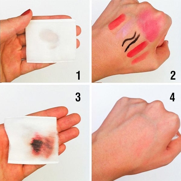 -Thấm nước tẩy trang vào miếng bông, rồi nhẹ nhàng lau khắp khuôn mặt. Chú ý vùng mắt, môi. Thay bông liên tục cho đến khi sạch hoàn toàn.