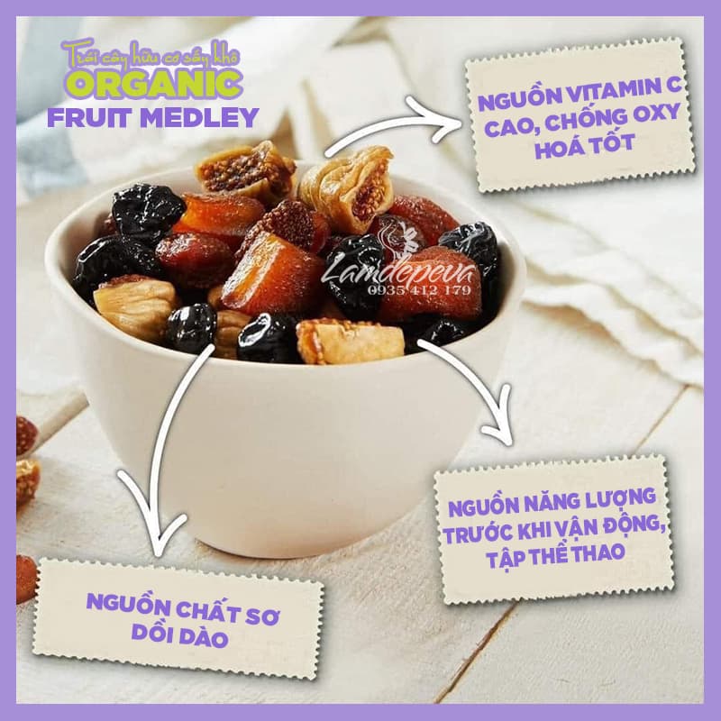 Organic Fruit Medley đóng gói tiện dụng, dễ mua. Sản phẩm an toàn cho mọi đối tượng người lớn, trẻ em, bà bầu,...