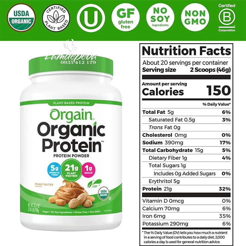 ✔ Orgain Organic Protein vị bơ đậu phộng đạt tiêu chuẩn cao: USDA_Organic, Vegan,... Không biến đổi gen, không gluten, không đậu nành.