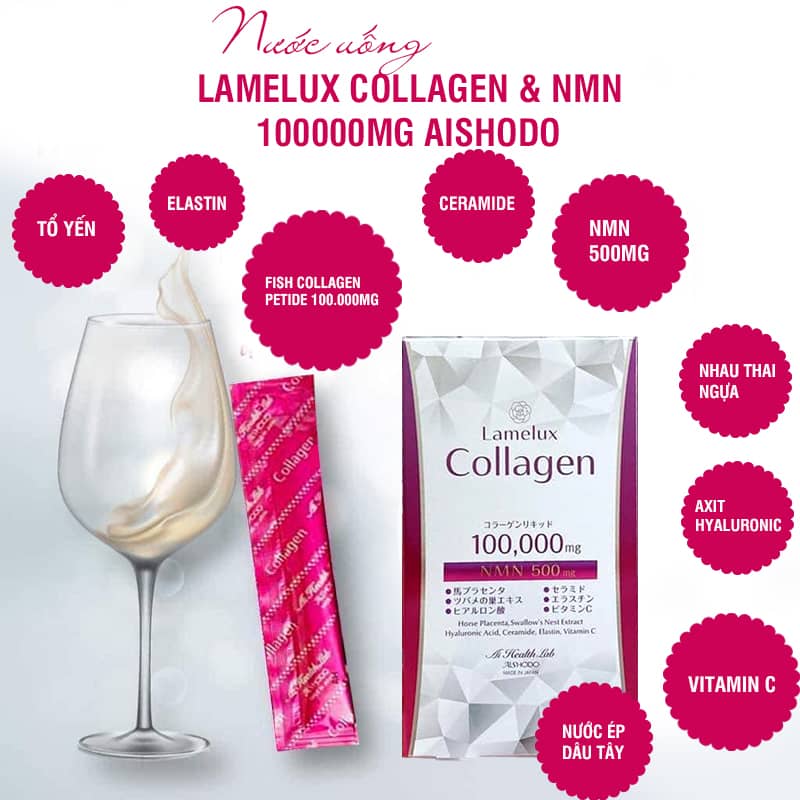 Lamelux Collagen & NMN 100000mg là thực phẩm chức năng hỗ trợ làm đẹp da, chống lão hóa, và nâng cao sức khỏe. Hàm lượng collagen peptide 10.000mg/ gói cao nhất thị trường, cùng với tinh chất nhau thai ngựa, tổ yến, hyaluronic acid, ceramide, elastin,... mang lại lợi ích tuyệt vời cho da. Đối với phụ nữ sau 30 tuổi, sau sinh, người bận rộn, hoặc làn da đang bị tổn thương, chọn bổ sung Collagen Lamelux là lý tưởng nhất, vừa tiện lợi, an toàn lại có hiệu quả cao.