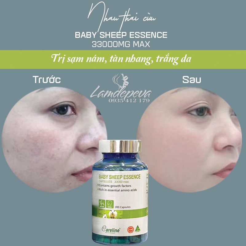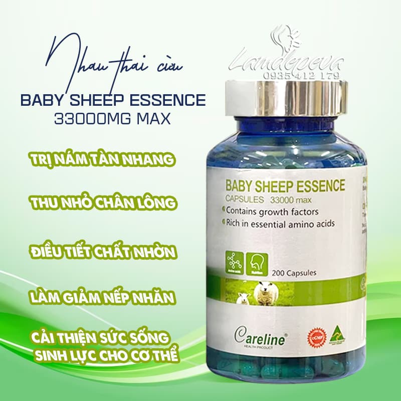 Nhau thai cừu Baby Sheep Essence Careline là sản phẩm được nhiều phụ nữ ở Úc lựa chọn. Với thành phần chính là tinh chất nhau thai cừu tươi rất giàu vi khoáng chất, acid amin, protein, các yếu tố tăng trưởng giúp nâng cao sức khỏe, loại bỏ nám tàn nhang, tăng cường sức sống cho da, đẩy lùi các dấu hiệu lão hóa sớm.