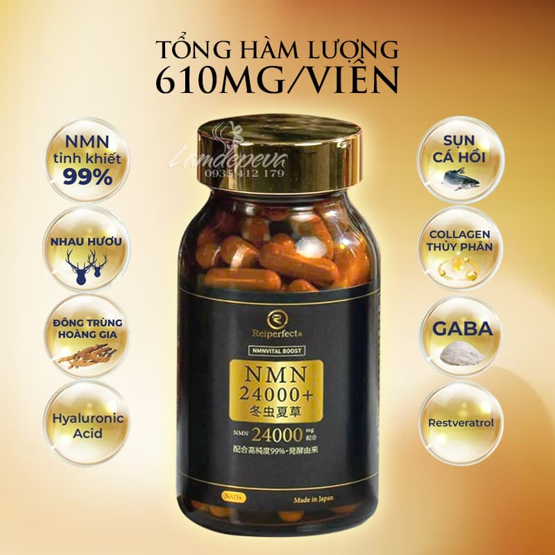 ✜ NMN 24000+ điều chế bởi công nghệ độc quyền bằng phương pháp lên men. NMN trong sản phẩm này có hoạt tính cao, độ tinh khiết đến 99%, và hàm lượng trên mỗi viên là 267mg.