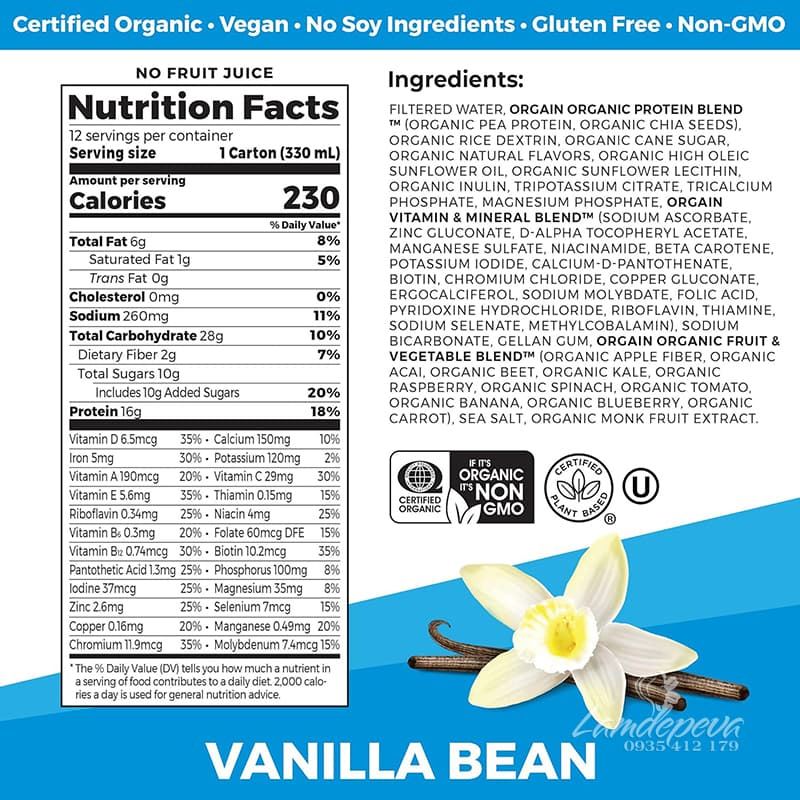 Thành phần dinh dưỡng của sữa Orgain 330ml: