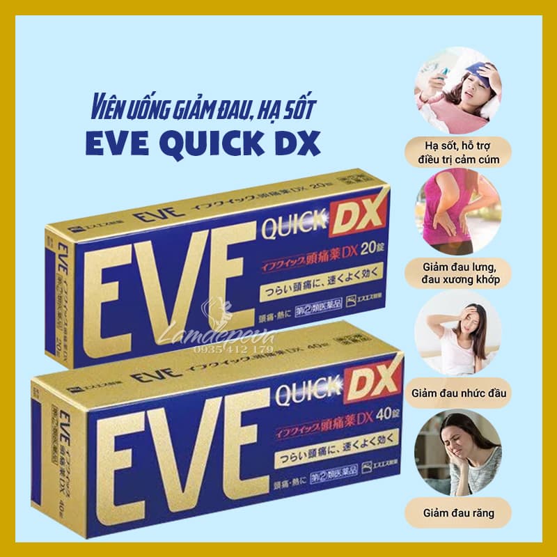 Thuốc giảm đau hạ sốt Eve Quick DX là sản phẩm nội địa Nhật Bản có trong tủ thuốc của các gia đình Nhật. Với thành phần Ibuprofen, sản phẩm hỗ trợ làm giảm đau nhanh chóng trong các trường hợp: Đau răng, đau đầu, đau nhức mỏi xương khớp (nhẹ), đau do chấn thương, đau bụng kinh nguyệt và làm giảm sốt và các triệu chứng cảm cúm.