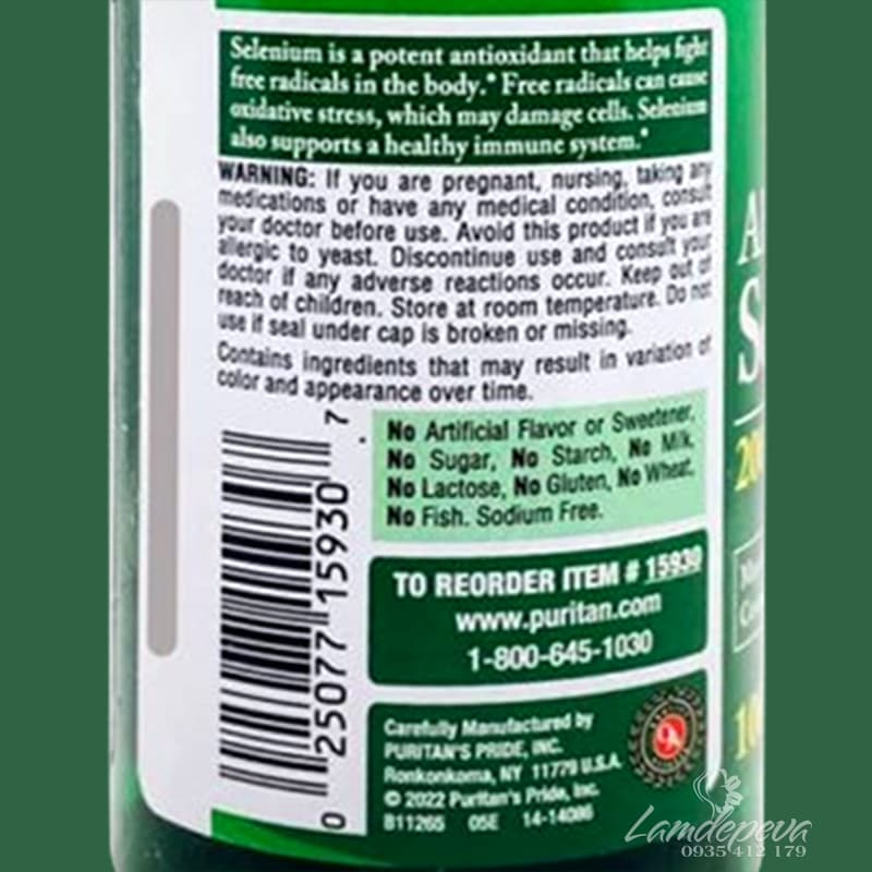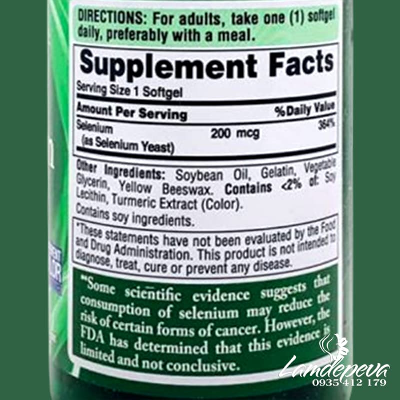 Viên uống bổ sung Selenium 200mcg của Mỹ đạt tiêu chuẩn chất lượng cao. Sản phẩm không chứa màu sắc nhân tạo, trứng, sữa, gluten, lactose,...