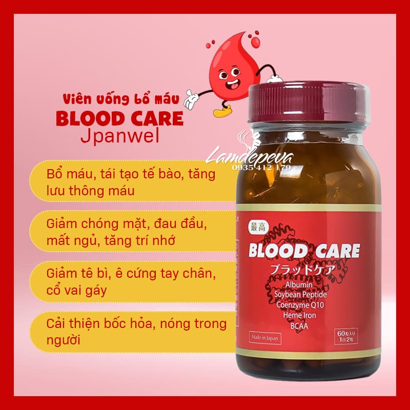 - Viên uống bổ máu Blood Care được điều chế với công thức độc đáo để hỗ trợ tái tạo máu, tăng tuần hoàn máu, rất tốt cho người bị thiếu máu.