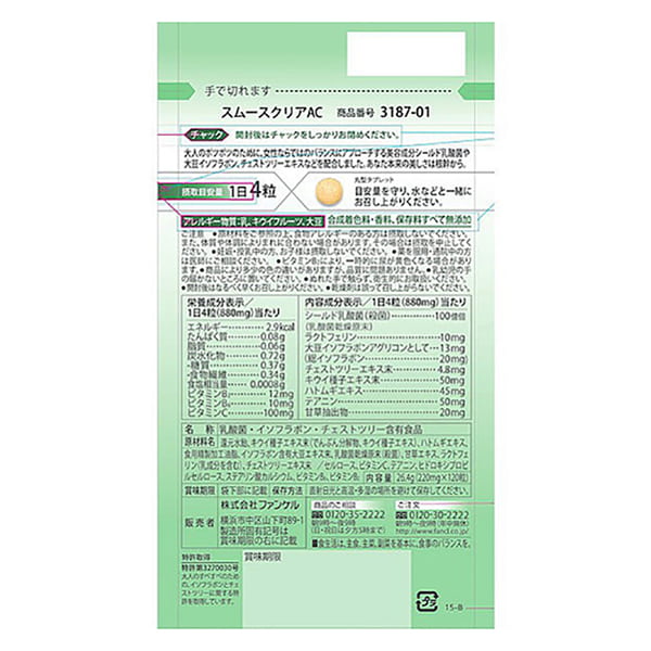 ➤Viên uống Fancl Smooth Clear AC của Nhật được nghiên cứu và điều chế bởi các chuyên gia. Công thức độc đáo gồm hàng tỷ lợi khuẩn đường ruột acid lactic, Isoflavone, chiết xuất thiên nhiên, cam thảo, vitamin B, C, giúp ổn định nội tiết, giảm nóng trong, hỗ trợ tiêu hóa đào thải độc tố ra ngoài. Bên cạnh đó, các dưỡng chất hỗ trợ làm đẹp da, tốt cho sức khỏe, không gây tác dụng phụ.