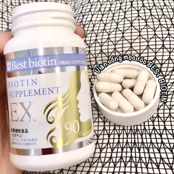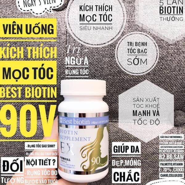 - Bổ sung biotin là giải pháp lý tưởng kích thích mọc tóc dày, dài hơn an toàn từ bên trong. Viên uống hỗ trợ mọc tóc Best Biotin của Nhật với thành phần chính là biotin, ngoài ra còn có rất nhiều vitamin B, vitamin E, C, Keratin giúp tóc đen mượt, chắc khỏe, phát triển tốt, làm chậm quá trình bạc tóc sớm.
