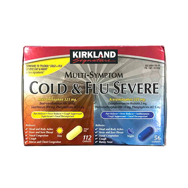 Viên uống trị cảm Kirkland Multi - Symptom Cold & Flu Severe là giải pháp để điều trị các chứng cảm cúm, sốt, đau đầu, ho có đờm, sổ mũi ngạt mũi, đau nhức mỏi,...