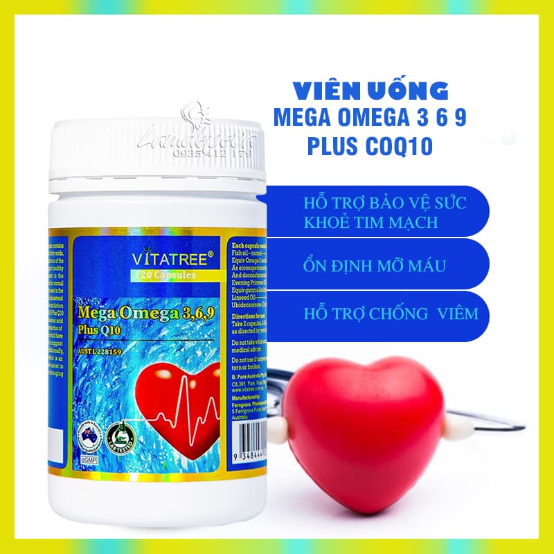 Vitatree Mega Omega 3 6 9 Plus Q10 là một sản phẩm hỗ trợ tim mạch rất được ưa chuộng tại Úc. Viên nang chứa dầu cá, dầu hoa anh thảo và hạt lanh, cùng coq10 có tác dụng giúp hỗ trợ chức năng tim mạch, giảm lượng cholesterol và mỡ máu. Ngoài ra, Omega 3 6 9 còn hỗ trợ trí não, thị lực, giảm đau viêm khớp,... thường gặp ở người lớn tuổi.